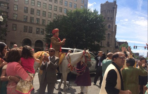 Image: Kim Clark. The groom in a wedding party approaches The Park Plaza Hotel in Boston, MA (2019)
